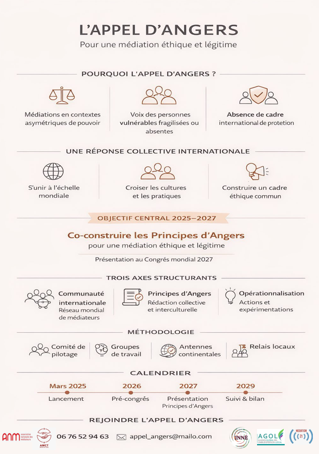 - 2025 : lancement officiel de l’Appel d’Angers lors du second Congrès de toutes les médiations.